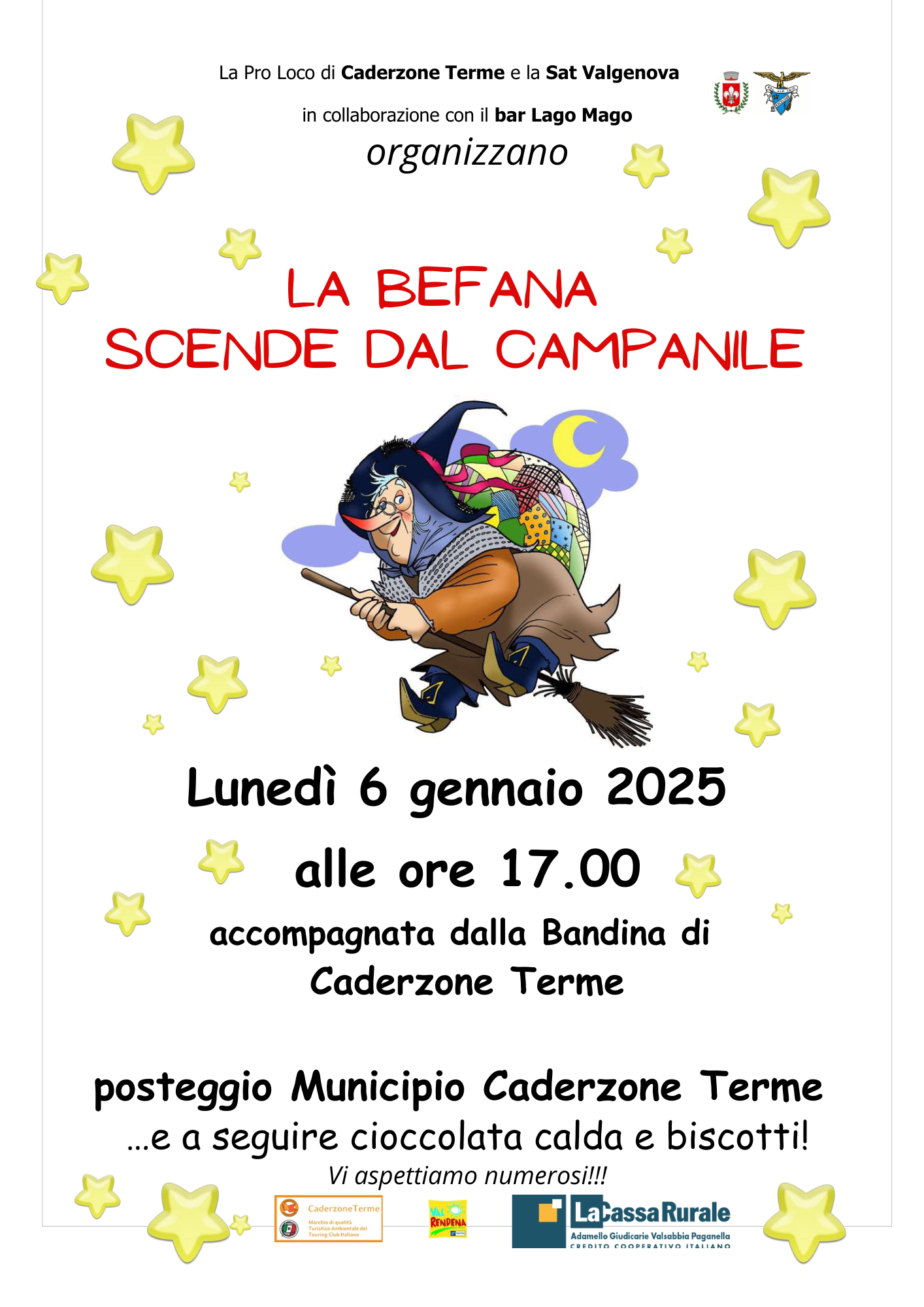La Pro Loco di Caderzone Terme e la Sat Valgenova in collaborazione con il bar Lago Mago organizzano "La Befana scende dal Campanile" accompagnata dalla Bandina di Caderzone Terme. A seguire cioccolata calda e biscotti.