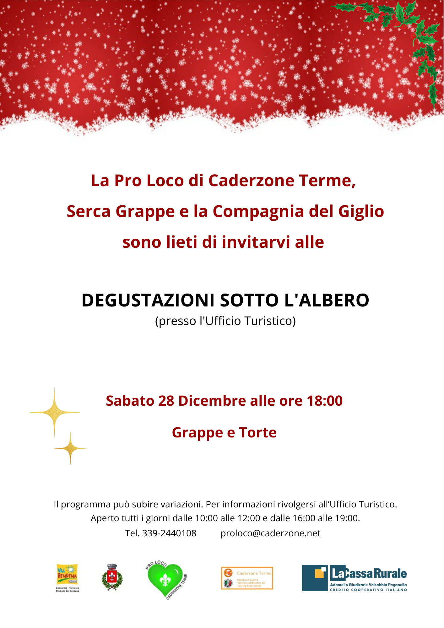 Cos'è La Pro Loco di Caderzone Terme, Serca Grappe e la Compagnia del Giglio sono lieti di invitarvi alle degustazioni sotto l'albero di grappe e torte (presso l'Ufficio Turistico)